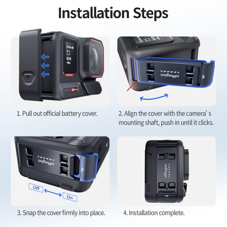 Tämä Insta360 Ace Pro -suoja tarjoaa erinomaisen suojan kamerasi tärkeimmille osille. Se on valmistettu kestävistä materiaaleista, jotka kestävät tehokkaasti iskuja, likaa ja roiskeita. Luotettavan Insta360-akkusuojan käyttö on välttämätöntä laitteesi käyttöiän pidentämiseksi. Pystysuuntainen akkusuojamme integroituu saumattomasti kameran muotoiluun säilyttäen sen elegantin ulkonäön ja parantaen samalla merkittävästi toiminnallisuutta. Se on täydellinen Insta360 Ace Pro -varaosa, joka varmistaa, että kamerasi on valmis seuraavaan haasteeseen.Helppo asennus ja parannettu käyttökokemus