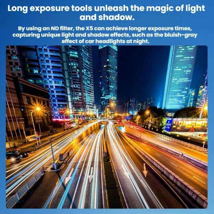 Insta360-kamerasuodattimen, kuten Insta360 X5 ND Filter v1:n, käyttö avaa luovia mahdollisuuksia. Voit kuvata alhaisemmalla ISO-arvolla kohinan vähentämiseksi tai käyttää suurempaa aukkoa saadaksesi pienemmän syväterävyyden ja luodaksesi dramaattisemman vaikutelman. Tämä Insta360 X5 ND Filter v1 on helppo kiinnittää ja irrottaa, joten suodattimien vaihtaminen kentällä on helppoa. Paranna kuvaamistasi ja anna videoillesi ammattimaisuutta tällä korkealaatuisella suodattimella.