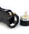 Strömbrytaren är placerad i bakre delen av ficklampan, vilket ger enkel åtkomst och minskar risken för oavsiktlig aktivering. Den ergonomiska designen gör ficklampan enkel att hantera, även i stressade situationer där snabb belysning krävs.
